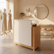 - Mostrador VienaMostrador RECEPCION VIENA Medidas del mostrador • Largo: 100 cm • Alto: 95 cm • Profundidad: 45 cm Características: • Tapa cerrada • Frente cerrado CON TAPA DE APOYO • 2 ESTANTES DEL LADO INTERNO • patas plásticas